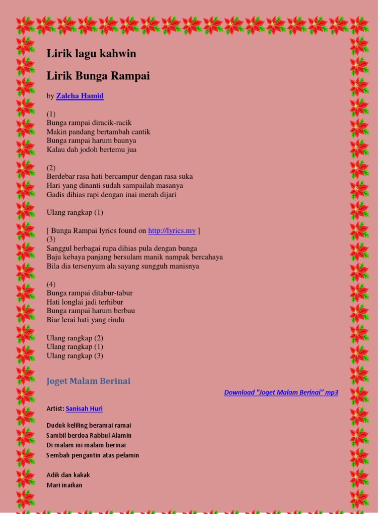 Oct 20 2010 Kumpulan Lagu - Lagu Melayu Rabu 20 Oktober 2010. Inai Di Jari Inai disapu dijari tandanya mesra Memberitahu hai dikau sudah dipunya Merah bercahaya bibirnya penuh bermakna Di jari manisnya tersarung cincin permata korus Alangkah indah temasya di malam itu Dua insan karam di lautan madu Menanam dendam berahi satu persatu Berkucup angan di bibir merayu-rayu Apa kiranya semua dendamnya itu. Tapi nasib baik tak kena bebel.